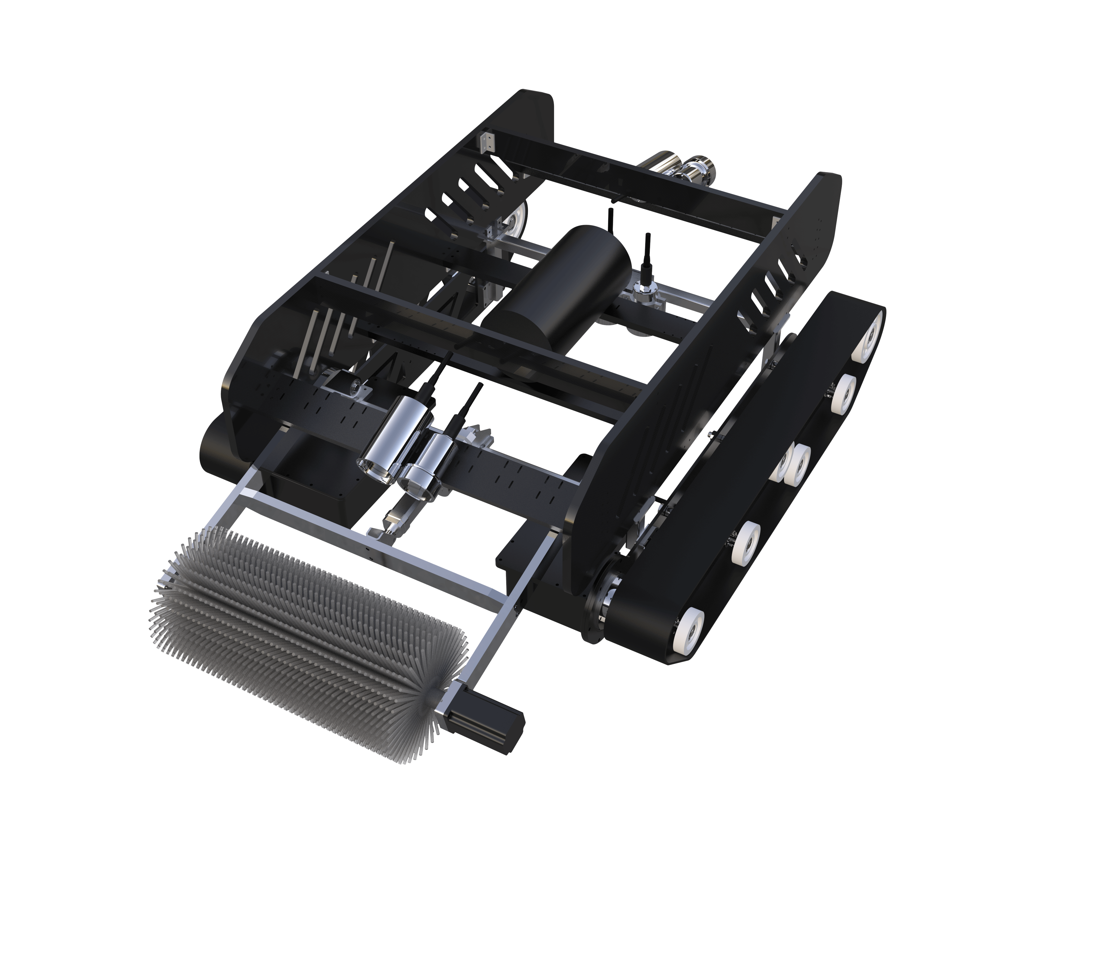 面板水上水下一体化检测机器人,用于水上、水下一体化检测。前部配置有毛刷及高压水枪,用于检测前的清理。相机采用矩阵阵列,从而确保对采集区域的覆盖,以及便于通过视觉识别手段,识别各类表面缺陷。底部采用冲击回波装置,可对混凝土内部缺陷进行检测。