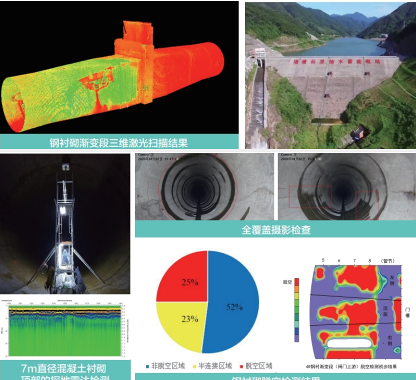 仙游抽水蓄能电站输水系统检测中,针对混凝土衬砌进行了常规的强度检测、探地雷达的混凝土脱空检测、全覆盖摄影检查、压力钢管渐变段三维激光扫描和冲击映像法的钢衬砌脱空检测。
